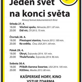 Během čtyř dnů na konci dubna si každý den promítneme dva vybrané dokumenty z festivalu dokumentů Jeden svět. I letos je vstupné zdarma, s možnosti si zakoupit v předsálí občerstveni. Jak už je zvykem, po každém promítaní můžete snímek na hlasovacím lístku ohodnotit. Po posledním sobotním vyhlásíme Vámi nejoceňovanější. Pro připomenutí, loni to byl norsky snímek „Na sever od slunce“. Loňska účast festivalu nás velmi mile překvapila. Doufáme proto, že i letos do kina v průběhu několika dnů zavítáte v hojném počtu. Abyste k tomu měli dobrý důvod, představme si velice stručně program promítacích dnů: