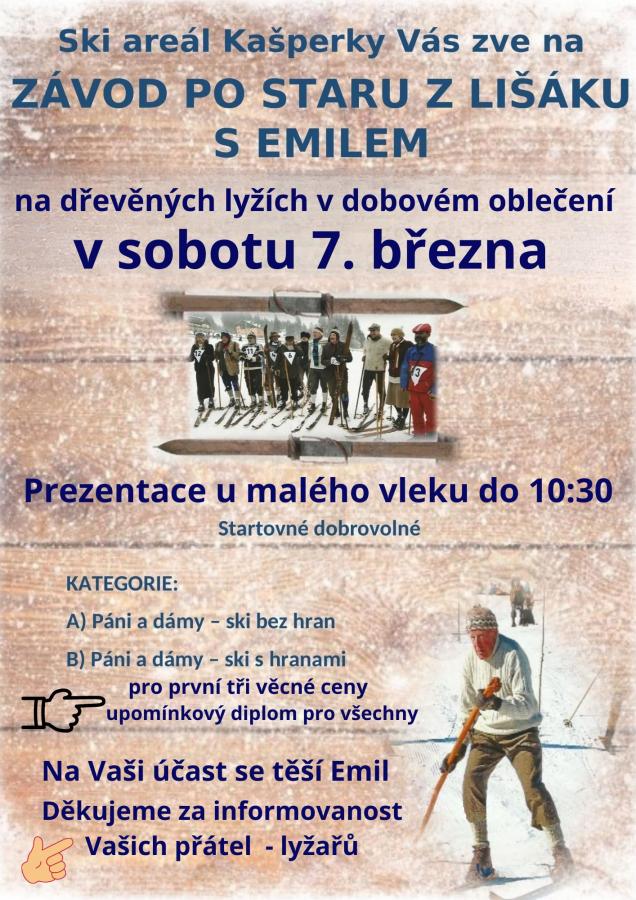 Ski areál Kašperky Vás zve na závod po staru z Lišáku s Emilem. Jedná se o sjezd na dřevěných lyžích v dobovém oblečení.